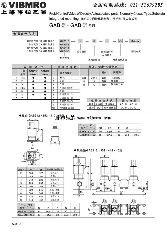 GAB312/352/412/452直通式2通阀/常闭 板式集成型Fruid Control Valve of Directly Actuated/two-ports, Normally Closed