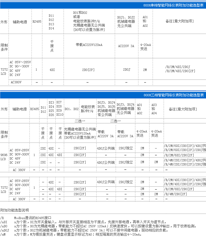 附加功能选型表