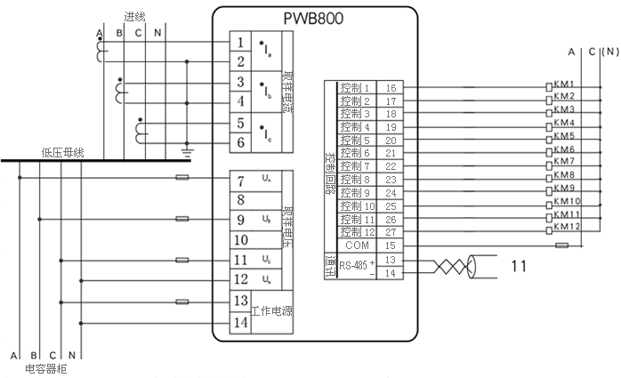 PWB800电容补偿控制器适用于400V供电系统,可以控制12组电容器,实现功率因数自动补偿控制,还具备电气监测、远程通讯功能。适合组成配电自动化监控系统。